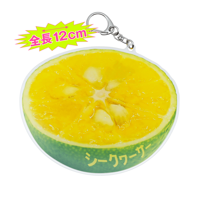 沖縄の爽やかな味をそのまま切り取ったような、シークワーサーのマギマギキーホルダー。 普通のキーホルダーじゃ物足りない人にぴったりの 12〜15cmのビッグサイズで、手に取った瞬間「大きっ!笑」となるインパクト満点のお土産です。 太陽を浴びた果実の鮮やかな黄色とフレッシュな断面をリアルに再現。バッグやリュックにつければ、南国の風を連れて歩いているような気分に。写真映えも抜群で、SNSにアップすれば「それ欲しい!」とコメントが集まること間違いなし。 シークワーサーは、沖縄では長寿のシンボルとも言われる伝統のフルーツ。そんな沖縄の魅力とユーモアをぎゅっと詰め込んだ「マギマギ」は、旅の思い出にも、友達へのプレゼントにも最適です。 約W120mm × H110mm