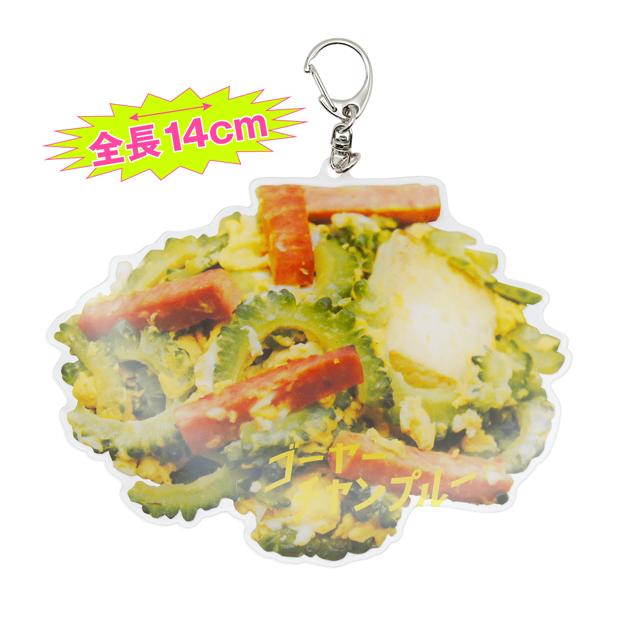 沖縄料理の代表「ゴーヤーチャンプルー」が、まさかのキーホルダー化!ゴーヤーの緑、卵の黄色、スパムのピンクと彩り豊かで、見た瞬間に沖縄を感じられる仕上がりです。料理の一皿からそのまま切り取ったようなデザインは、驚きとユーモアにあふれています。